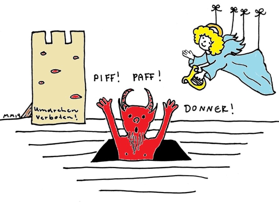 Auch wird mit allerlei trügerischen Tricks gearbeitet: An kaum erkennbaren Drahtseilen schweben Engelchen am Bühnenhimmel, während der Teufel (mit viel Schall und Rauch und Lichteffekten) im Boden versinkt; genauer gesagt: »Er verschwindet in der Versenkung.« Die Versenkung ist eine Öffnung im Bühnenboden nebst einer Plattform, die sich hinauf- und hinunterfahren lässt.